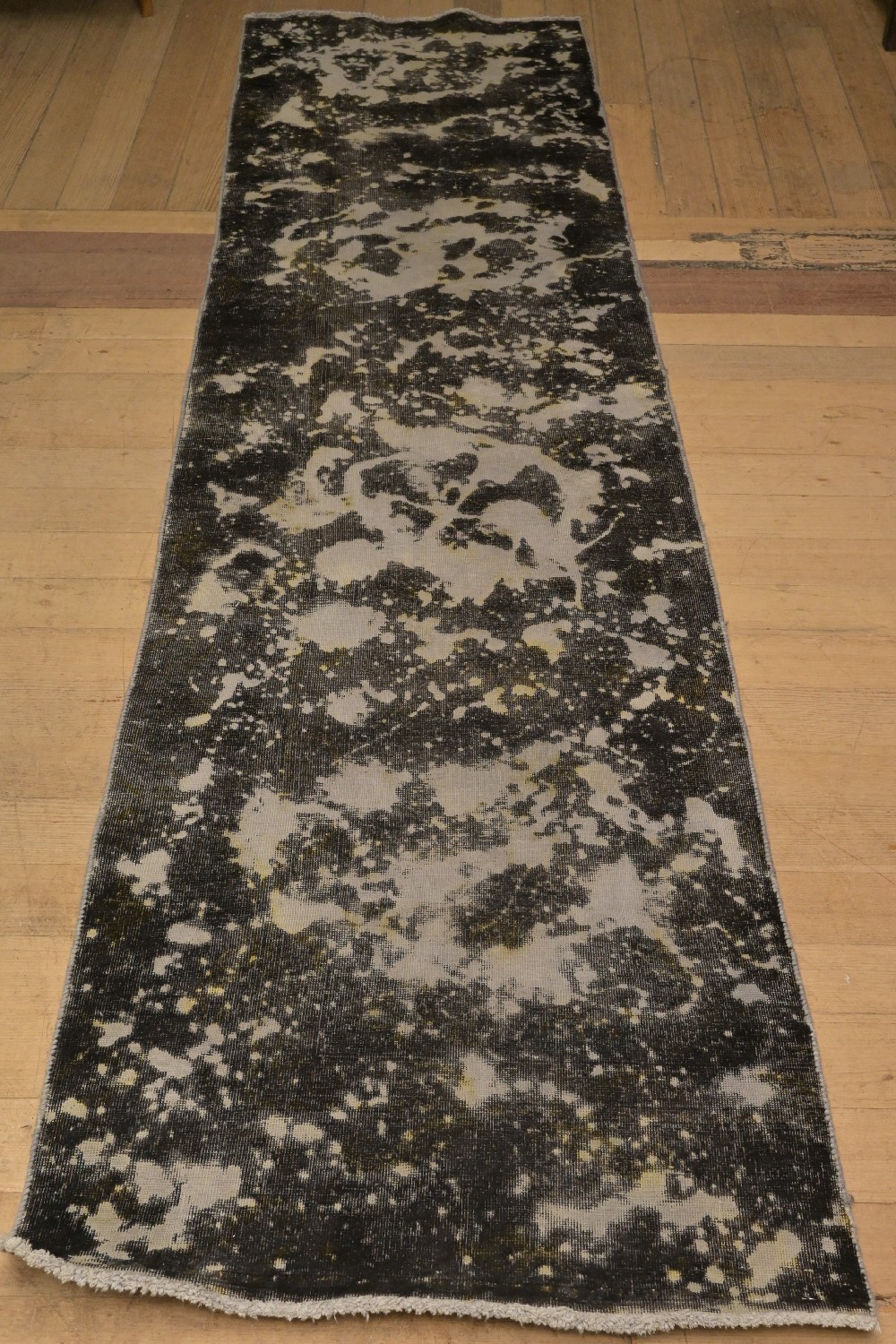 A PERSIAN OVERDYED TABRIZ HALL RUNNER. MODERN WOOL IN STRESSED STYLE. IN TONES OF CHARCOAL, GREY, AND IVORY. SIZE: 316 X 80 CM. ORIGIN: PERSIA - RRP: $1,500. DOCUMENTATION OF AUTHENTICITY INCLUDED