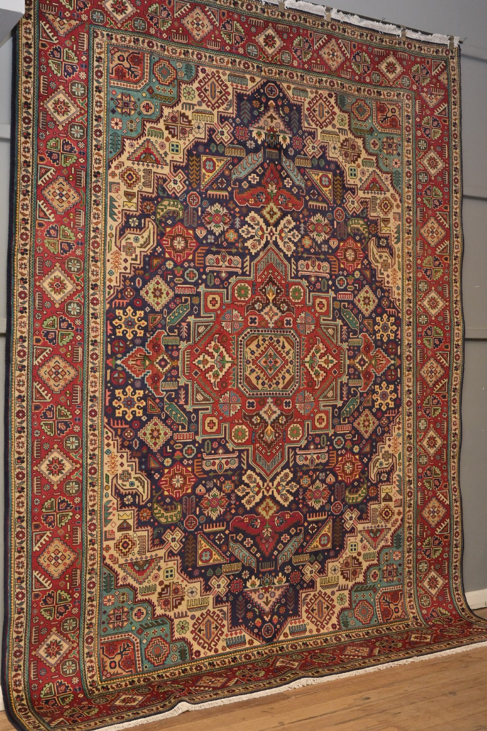 A VIBRANT AND COLOURFUL PERSIAN TABRIZ RUG. 100% WOOL PILE. GEOMETRIC TABRIZ DESIGN OF BOLD ANCHORED GEOMETRIC MEDALLION IN RUBY RED ON A RICH PERSIN BLUE FIELD. WITH ALL OVER FLORAL SPRAYS, PAISLEY, AND TREE OF LIFE MOTIFS, ROSETTES, AND TRIBAL MOTIFS. MAJOR BORDER OF FLORAL SPRAYS, TENDRILS & SHAH ABASI PALMETTES AND MULTIPLE TRIBAL MOTIFS. IN A ROYAL RED FIELD. SIZE: 355 X 259 CM. ORIGIN: PERSIA - RRP: $6,500. DOCUMENTATION OF AUTHENTICITY INCLUDED