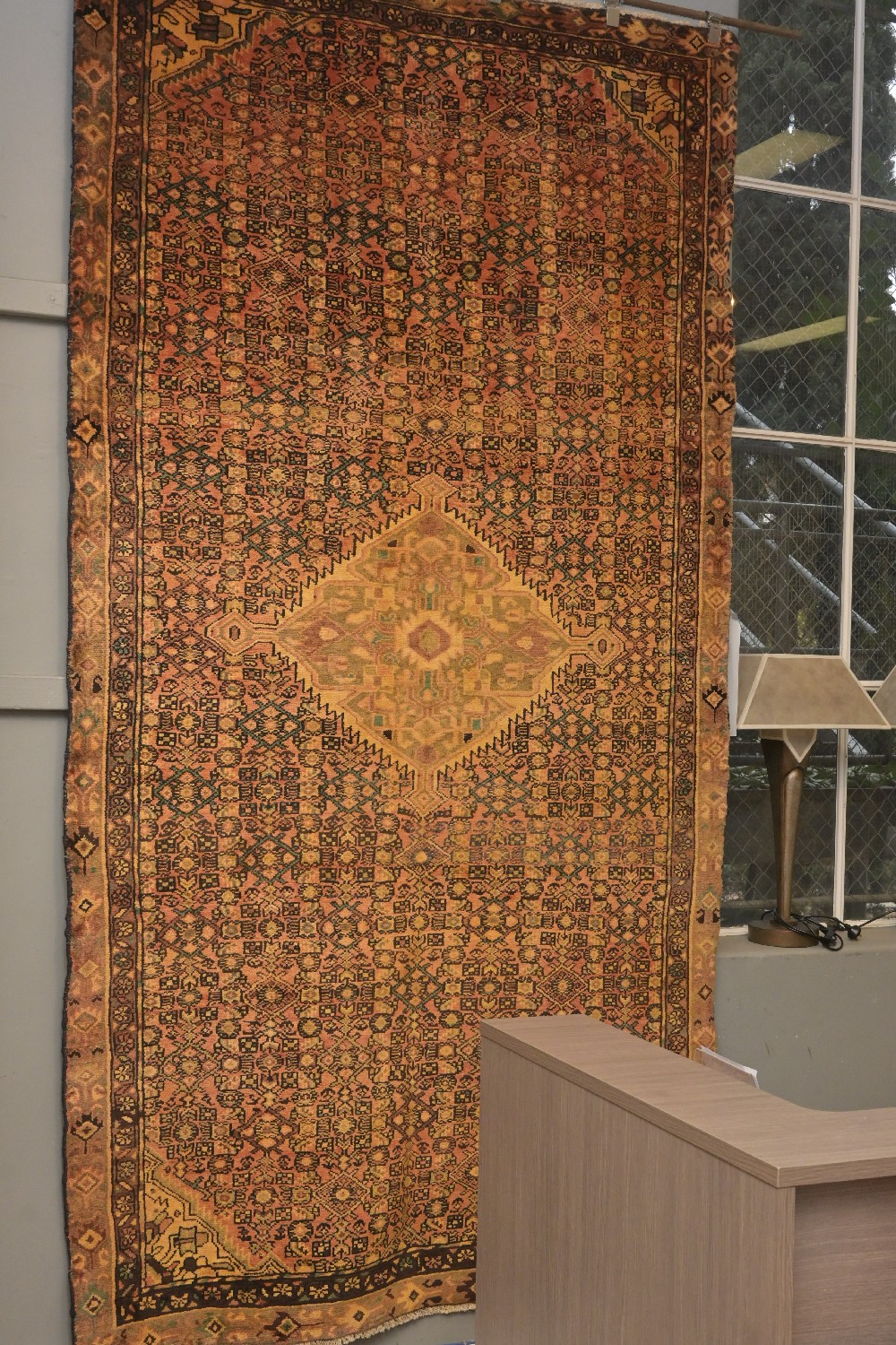A LARGE 1970s PERSIAN HOSSAINABAD RUG. 100% WOOL PILE. HAND-KNOTTED VILLAGE WEAVE FROM THE HAMADAN REGION WITH A DESIGN OF CENTRAL DIAMOND MEDALLION FILLED WITH GEOMETRIC MOTIFS ON A SOFT LIGHT, RED-TONED FIELD OF ALL OVER HERATI MAHI PATTERNS. BORDER OF ROSETTES AND TRIBAL PAISLEYS. ALL OVER SOFT MELLOW TONES. ORIGIN: PERSIA - RRP: $2,900 -SIZE: 298 X 159 CM. DOCUMENTATION OF AUTHENTICITY INCLUDED