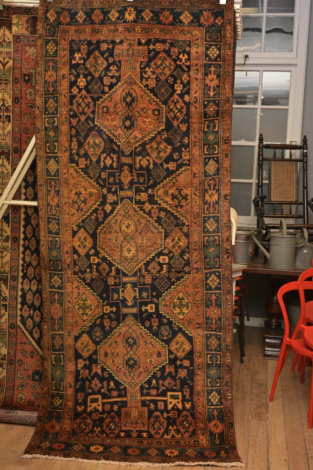 A DECORATIVE 1970s NOMADIC PERSIAN SHAHSAVAN RUNNER, 100% HAND-SPUN WOOL PILE. ORGANIC NATURAL DYES. HAND-KNOTTED NOMADIC WEAVE WITH DESIGN OF TRIPLE HEXAGONAL MEDALLIONS CONTAINING AMULETS AND TRIBAL MOTIFS. SET ON A CHARCOAL TONE FIELD OF FLORAL PATTERNS, AMULETS, BIRD, AND TRIBAL MOTIFS. BORDER OF TRIBAL COMB AND CHESSBOARD MOTIFS. SIZE: 280 X 114 CM. ORIGIN: PERSIA - RRP: $1,600. DOCUMENTATION OF AUTHENTICITY INCLUDED