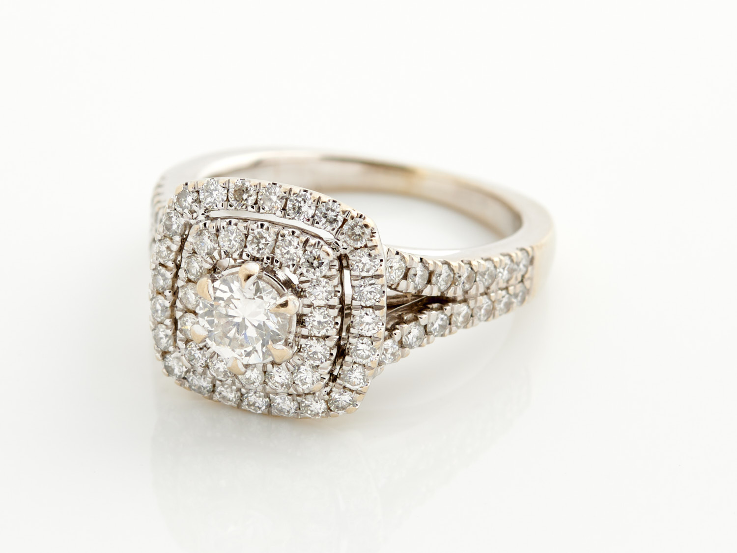 A DIAMOND CLUSTER RING IN 18CT WHITE GOLD, CENTRING A BRILLIANT-CUT DIAMOND WEIGHING 0.30CTS (F/VS2), SIZE J, ACCOMPANIED BY IGI CERTIFICATE 384952668