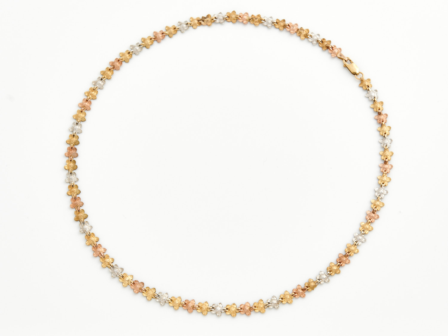A FLORAL LINK NECKLACE IN 9CT TRI-COLOUR GOLD, LENGTH APPROXIMATELY 400MM, 18.7GMS