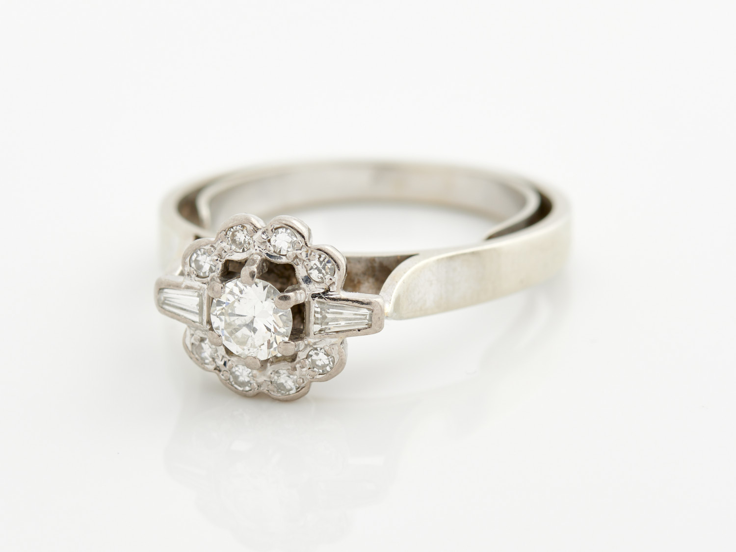 A DIAMOND RING IN 18CT WHITE GOLD, THE DIAMONDS TOTALLING 0.79CTS, SIZE Q, 6.4GMS, ACCOMPANIED BY A VALUATION
