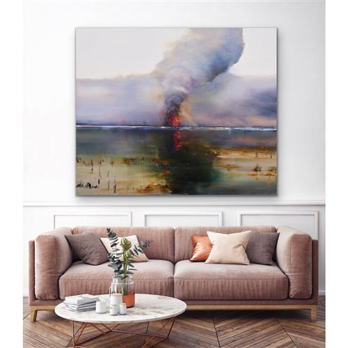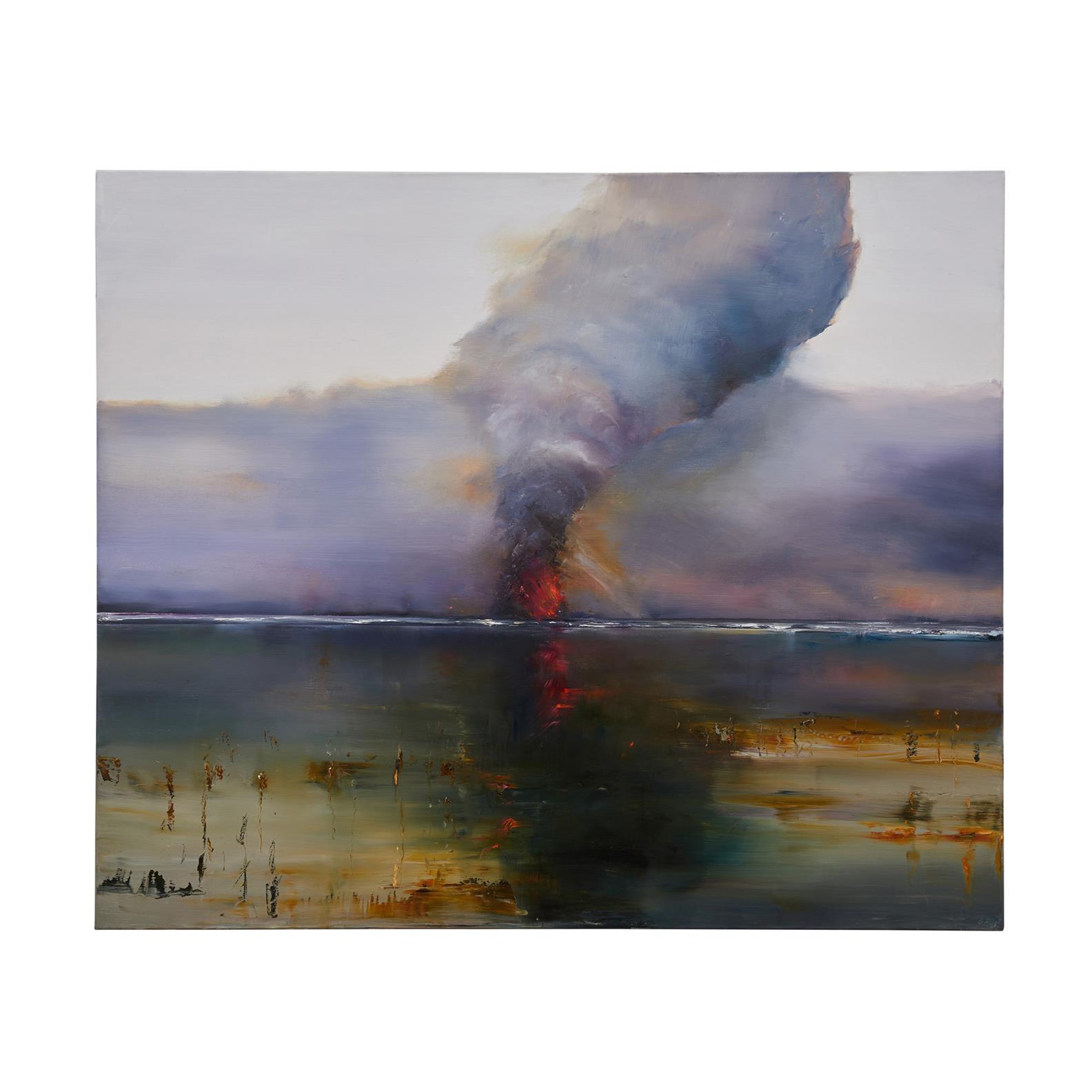 Vertical curved scratch to the right of central fire, minor paint loss to right edge at horizon line, scuff marks and paint loss down left edge