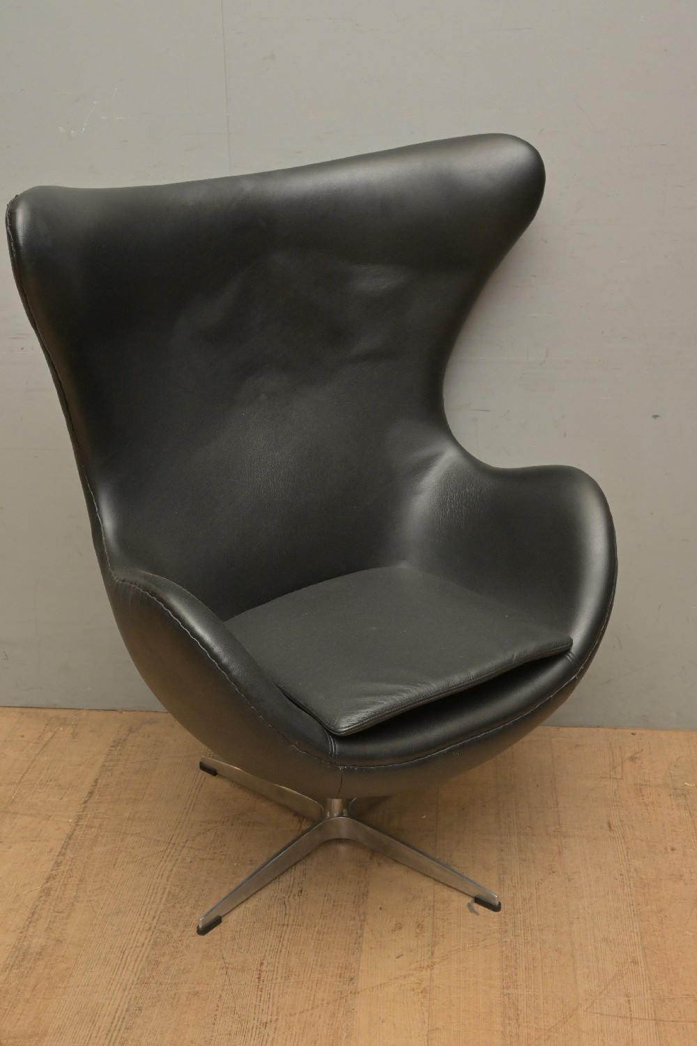 A BLACK LEATHER UPHOLSTERED EGG CHAIR IN THE STYLE OF ARNE JACOBSEN (A/F) (114H X 87W X 71D CM) (LEONARD JOEL DELIVERY SIZE: X-LARGE)