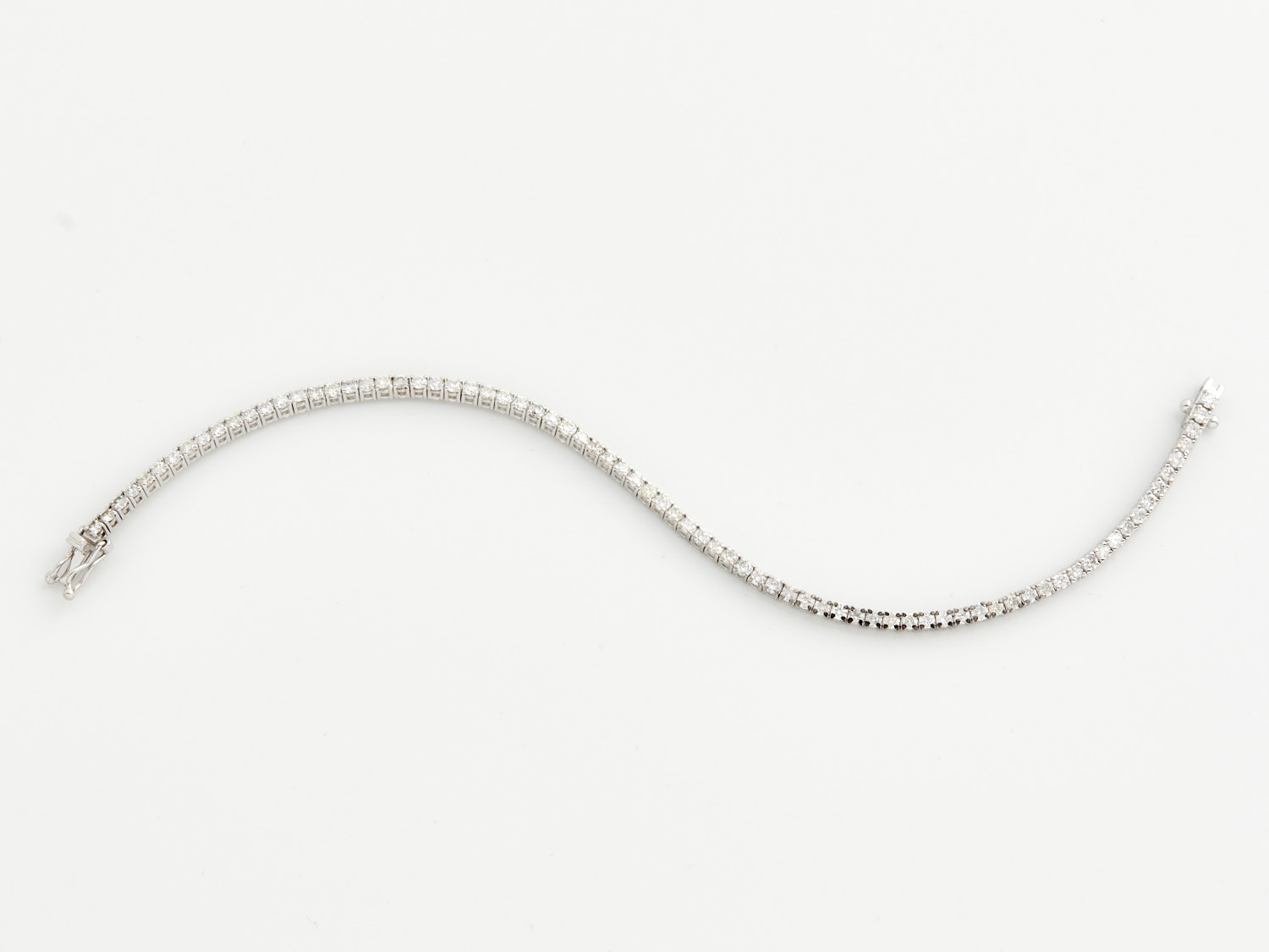 A DIAMOND LINE BRACELET IN 18CT WHITE GOLD, THE DIAMONDS TOTALLING 3.55CTS, F-G/SI-P1, LENGTH APPROXIMATELY 190MM, ACCOMPANIED BY A VALUATION