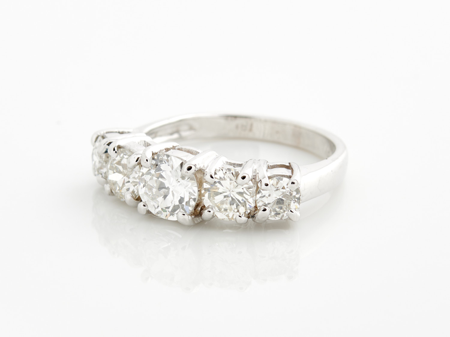 A FIVE STONE OLD EUROPEAN CUT DIAMOND RING IN 18CT WHITE GOLD, THE DIAMONDS TOTALLING 2.6CTS, SIZE P