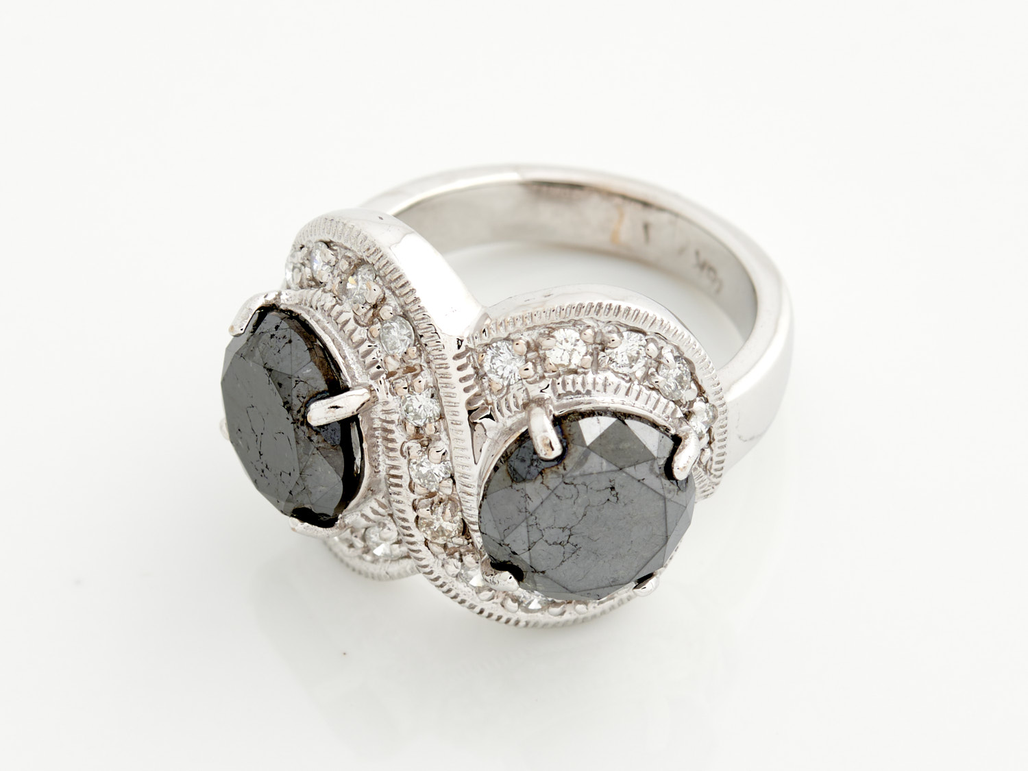 A BLACK AND WHITE DIAMOND RING, IN 18CT WHITE GOLD, THE BLACK DIAMONDS TOTALLING 6.75CTS, THE WHITE DIAMONDS TOTALLING 0.35CTS, SIZE N