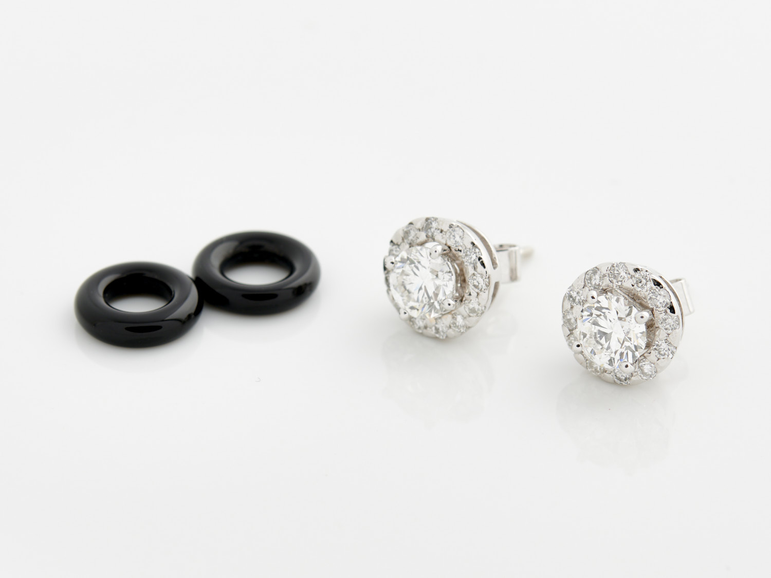 A PAIR OF CONVERTIBLE DIAMOND AND ONYX EARRINGS IN 18CT WHITE GOLD, THE CENTRAL DIAMONDS TOTALLING 0.70CTS EACH (F/S12), THE DIAMOND HALOS TOTALLING 0.3CT (G/VS), ACCOMPANIED BY A COPY OF A GIA REPORT AND VALUATION