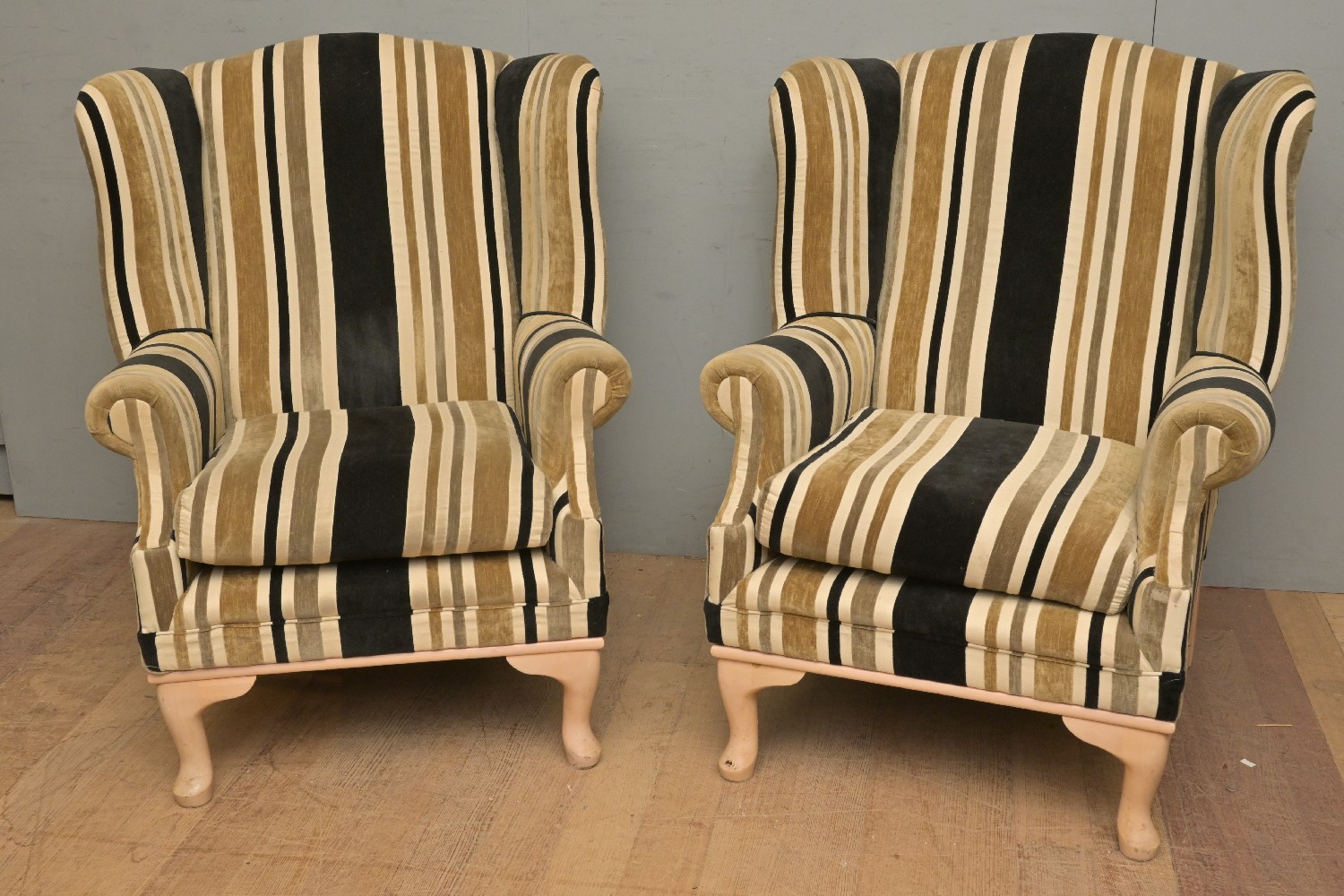 A PAIR OF GOLD AND BLACK STRIPED WINGBACK ARM CHAIRS (A/F) (104H X 80W X 87D CM) (PLEASE NOTE THIS HEAVY ITEM MUST BE REMOVED BY CARRIERS AT THE CUSTOMER'S EXPENSE. LEONARD JOEL STAFF CANNOT ASSIST CARRYING THIS ITEM) (LARGE ITEM)