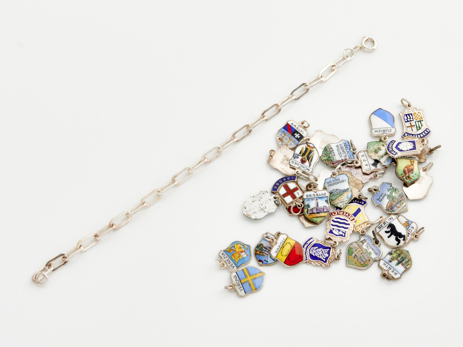 A COLLECTION OF ENAMEL SHIELD CHARMS IN SILVER AND STERLING SILVER, TOGETHER WITH A PAPER-LINK BRACELET IN STERLING SILVER MEASURING 75MM, TOTAL WEIGHT 44.52GMS