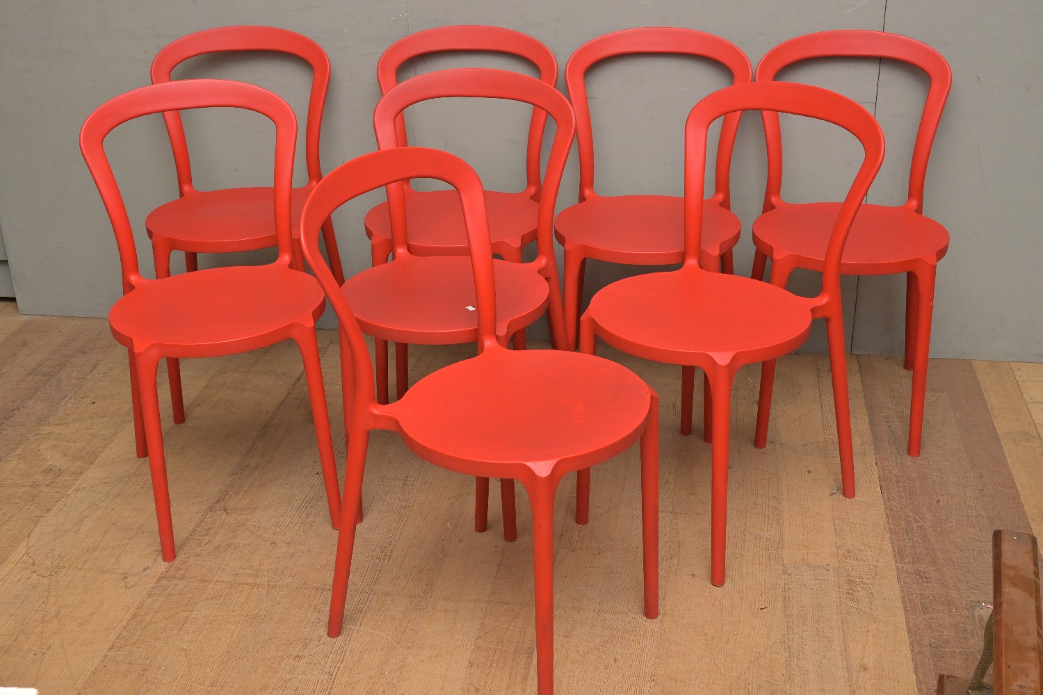 A SET OF EIGHT RED ITALIAN DINING CHAIRS (A/F) (82H X 43W X 53D CM) (LEONARD JOEL DELIVERY SIZE: X-LARGE)