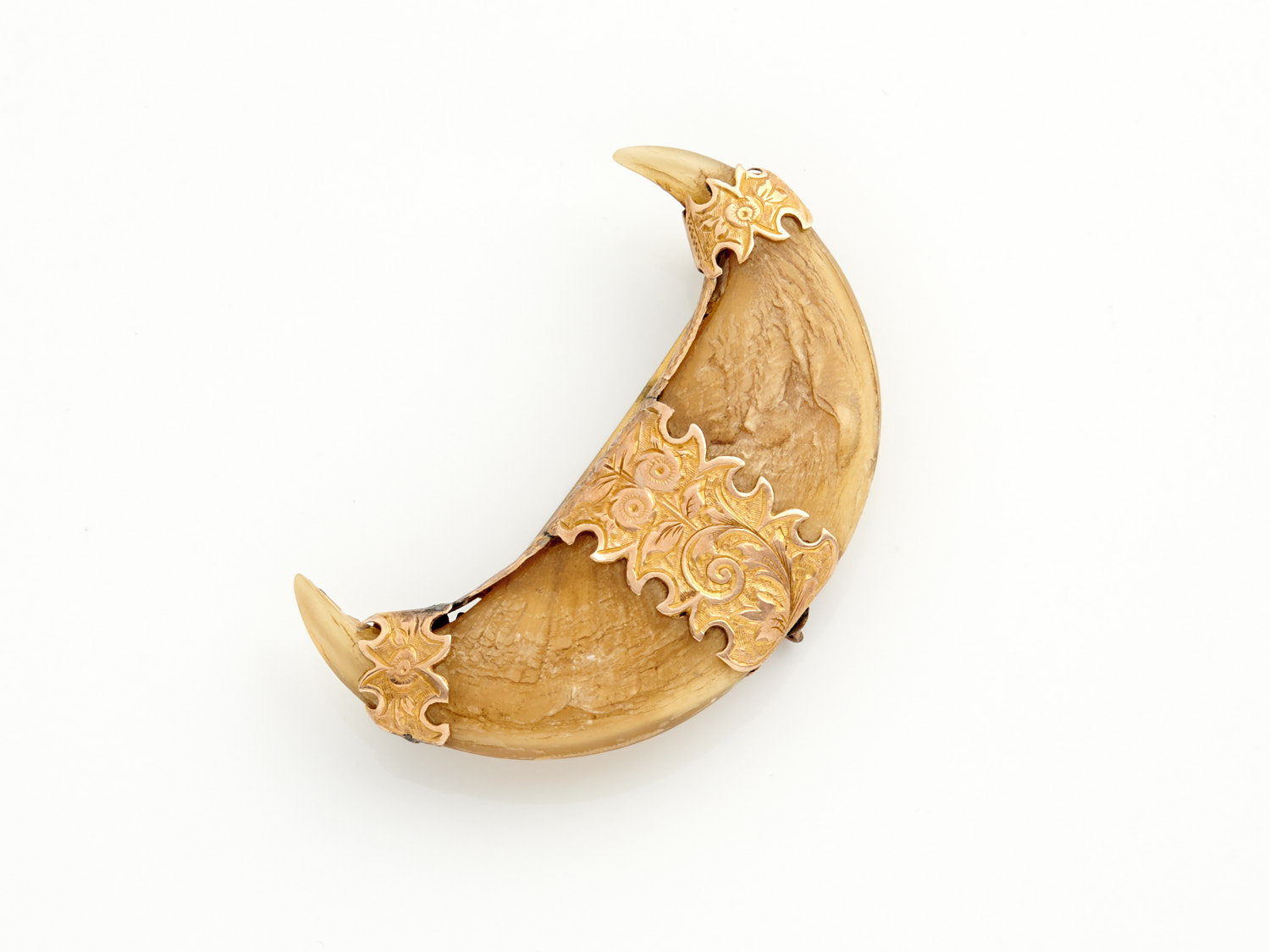 A TIGERS TOOTH BROOCH MOUNTED IN 9CT GOLD, 45MM