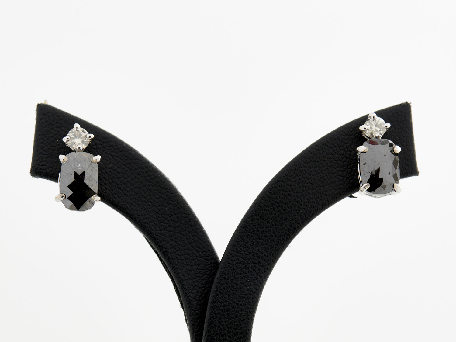 A PAIR OF BLACK AND WHITE DIAMOND EARRINGS IN 18CT WHITE GOLD, THE BLACK DIAMONDS WEIGHING 2.78CTS, THE WHITE DIAMONDS WEIGHING 0.28CTS, TO POST AND BUTTERFLY FITTINGS