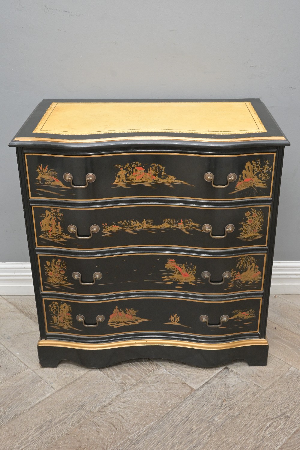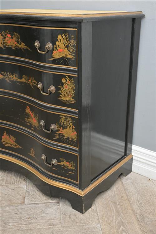 A GEORGIAN-STYLE CHINOISERIE CHEST OF DRAWERS, THE TOP LEATHER LINED (A/F) (78H X 75W X 44D CM) (LEONARD JOEL DELIVERY SIZE: LARGE)