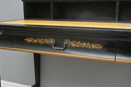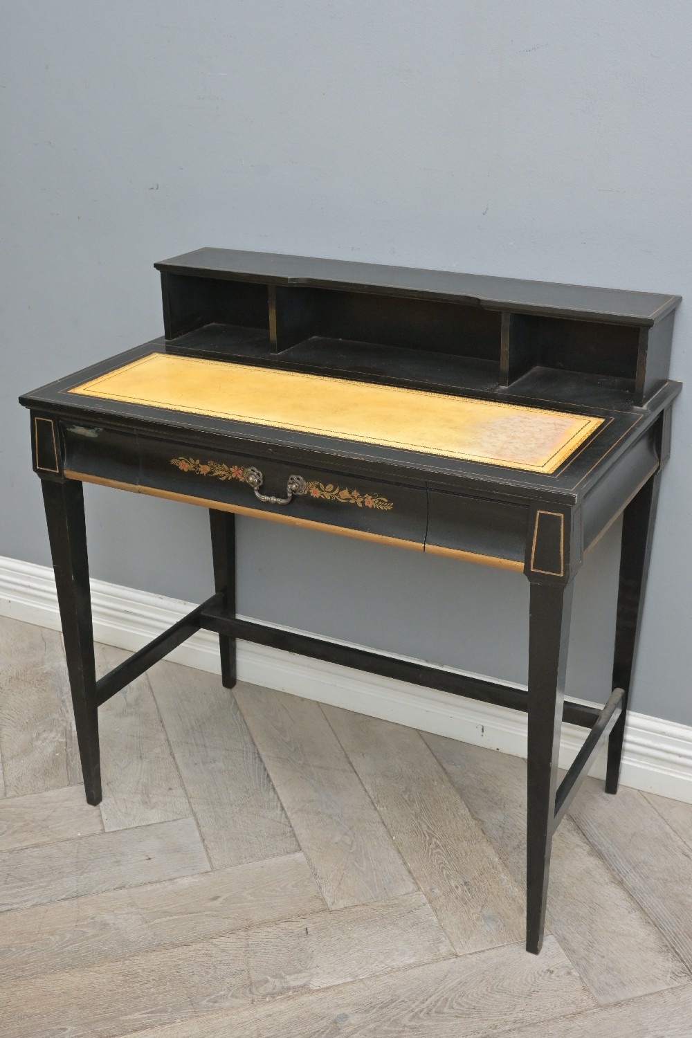 A BLACK-LACQUERED WRITING TABLE IN GEORGIAN MANNER, WITH LEATHER-LINED WRITING SURFACE (A/F) (88H X 87W X 51 D CM) (LEONARD JOEL DELIVERY SIZE: LARGE)