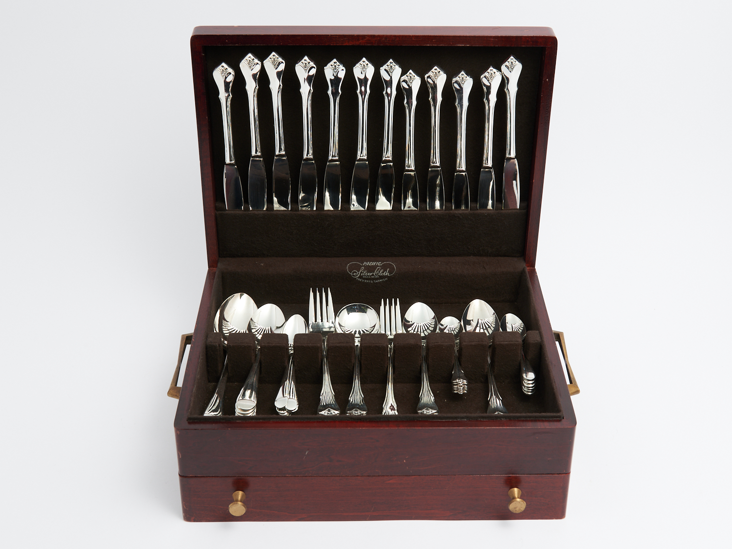 AN ASSEMBLED SILVER PLATE CUTLERY SET IN CANTEEN W.42CM, LEONARD JOEL DELIVERY SIZE: MEDIUM