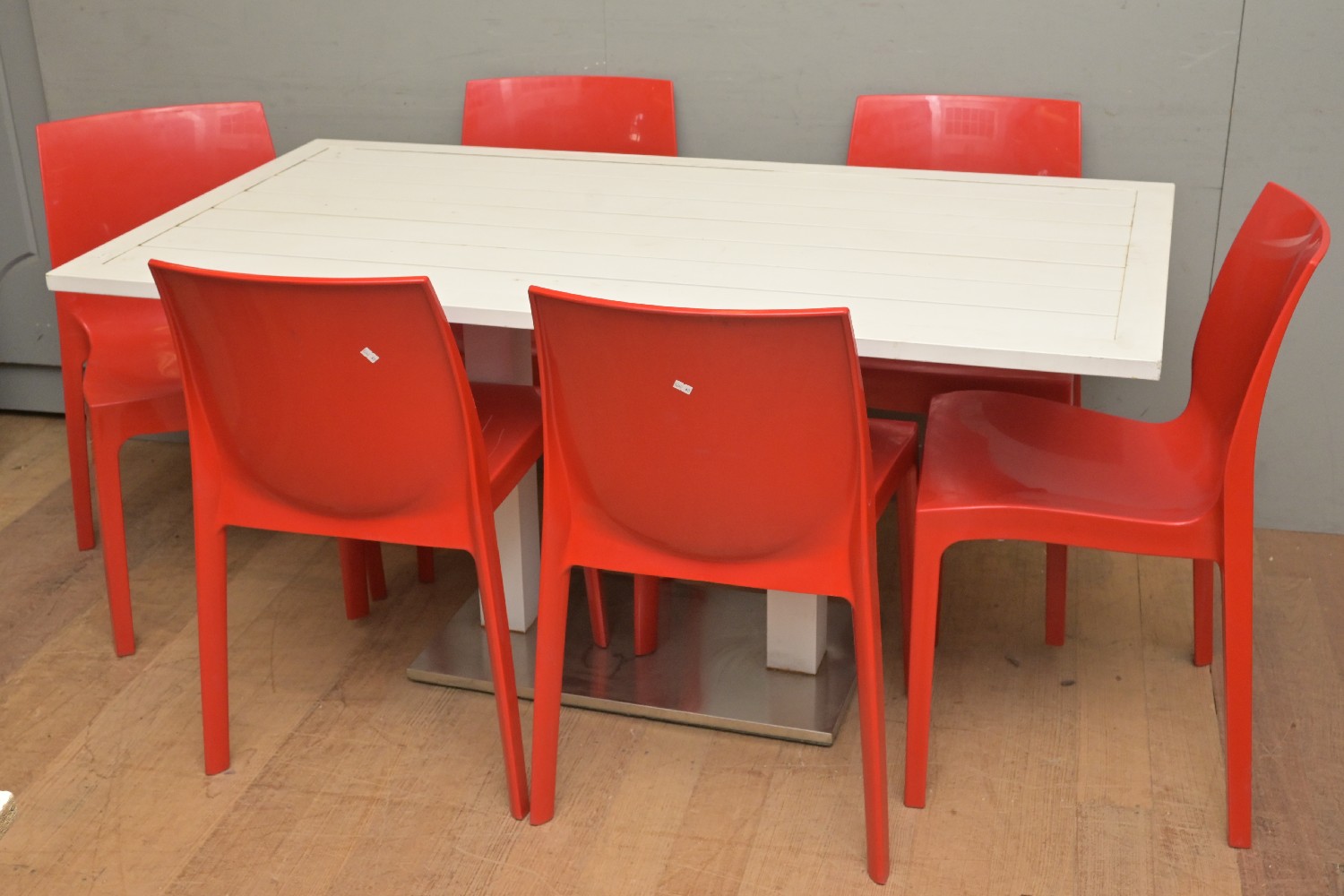 A SEVEN PIECE OUTDOOR SETTING INCLUDING PEDRALI CHAIRS (A/F) (73H X 150W X 81D CM) (PLEASE NOTE THIS HEAVY ITEM MUST BE REMOVED BY CARRIERS AT THE CUSTOMER'S EXPENSE. LEONARD JOEL STAFF CANNOT ASSIST CARRYING THIS ITEM) (LARGE ITEM)