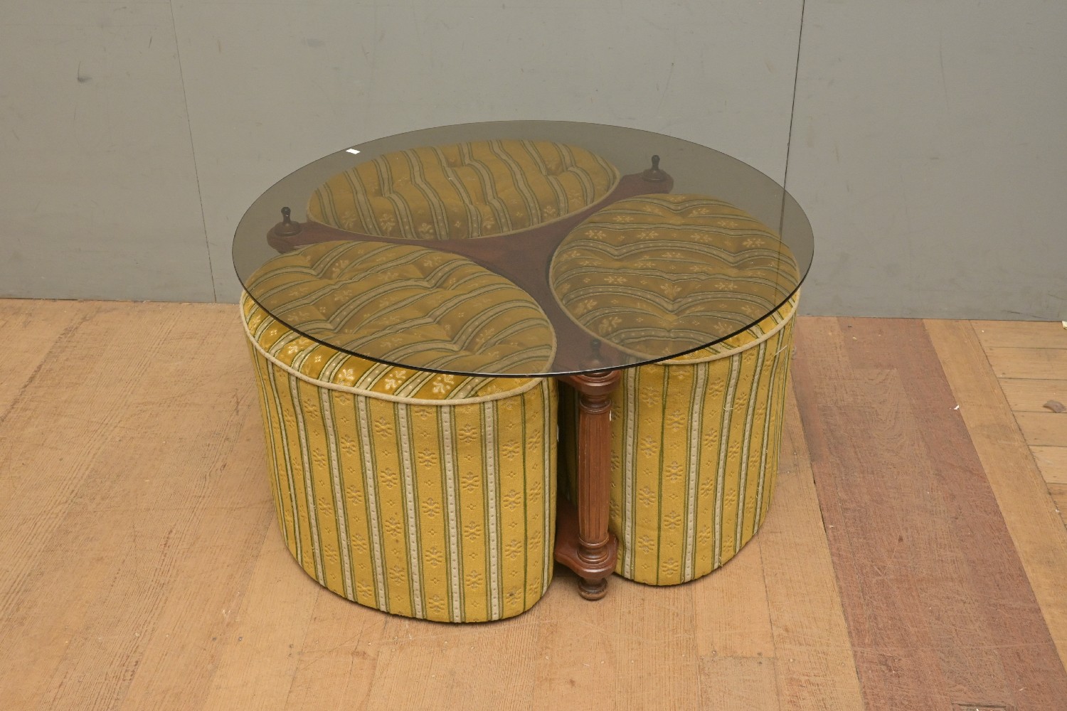 A TH BROWN CIRCULAR WOODEN-BASED COFFEE TABLE WITH ORIGINAL GLASS TOP AND THREE FITTED ORIGINAL UPHOLSTERED STOOLS (A/F) (42H X 85D CM) (LEONARD JOEL DELIVERY SIZE: LARGE)