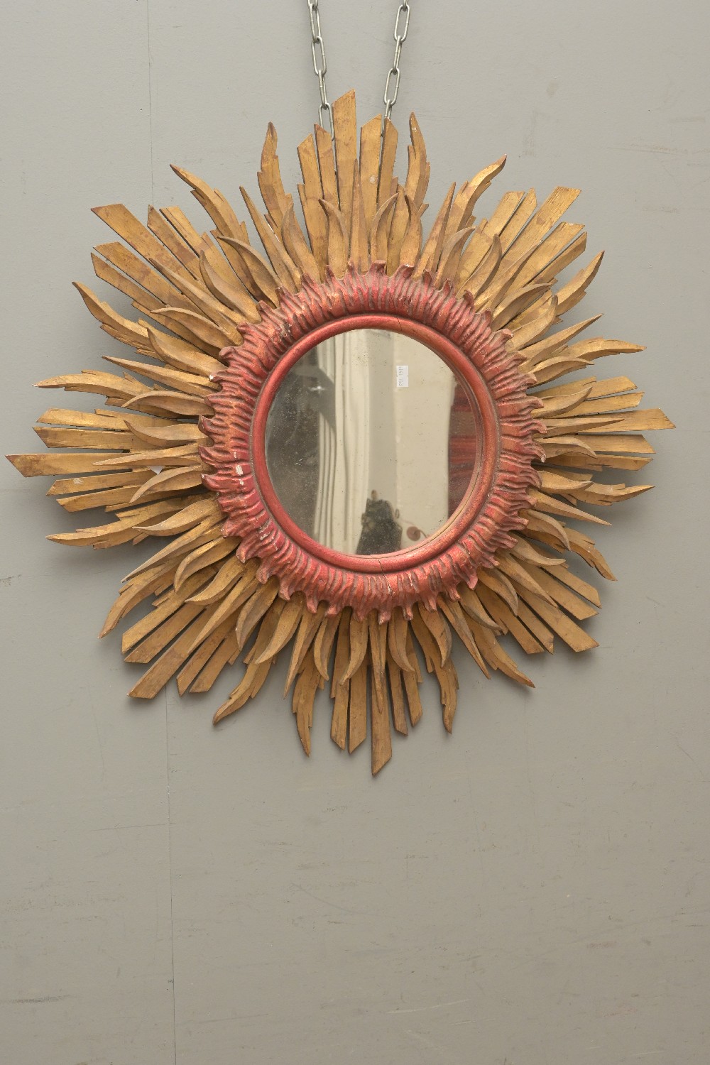 AN EARLY 20th CENTURY FRENCH CARVED AND PAINTED WOOD SUNBURST MIRROR (A/F) (72D CM) (LEONARD JOEL DELIVERY SIZE: MEDIUM)