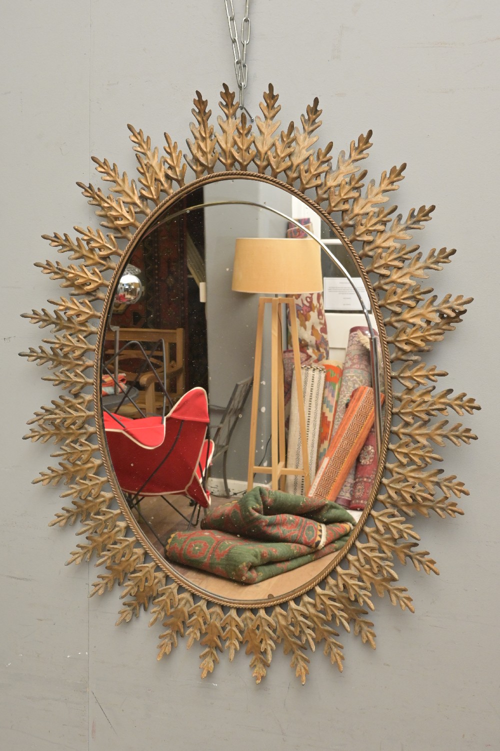 AN EARLY 20TH CENTURY FRENCH GILT METAL OVAL SUNBURST MIRROR (A/F) (96H X 77W CM) (LEONARD JOEL DELIVERY SIZE: LARGE)