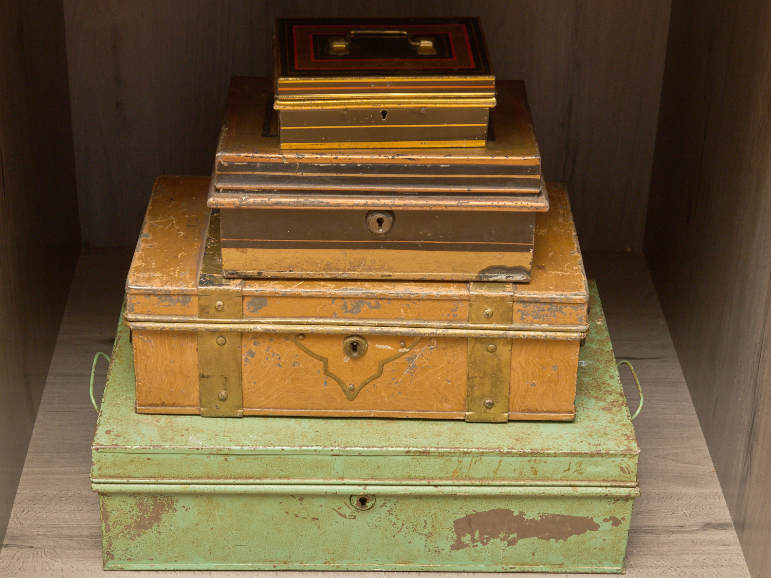 A GROUP OF FOUR GRADUATED METAL SAFE BOXES L.41CM (LARGEST), LEONARD JOEL DELIVERY SIZE: SMALL