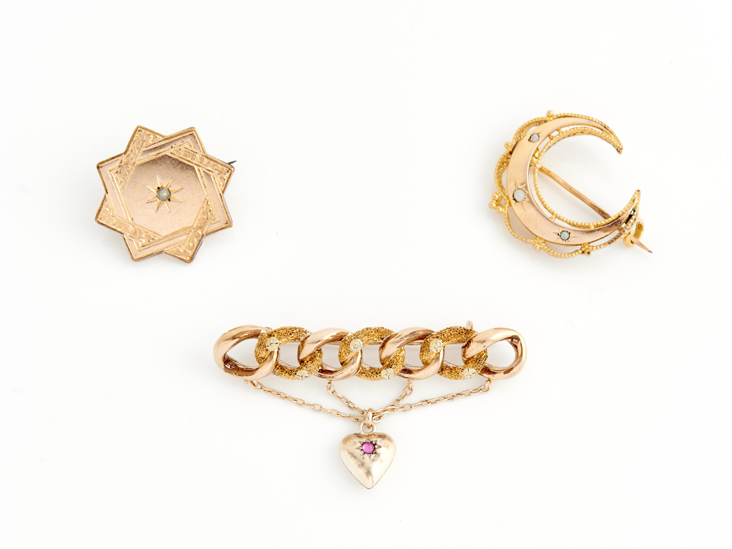 A COLLECTION OF VICTORIAN BROOCHES INCLUDING A CRESCENT IN 15CT GOLD