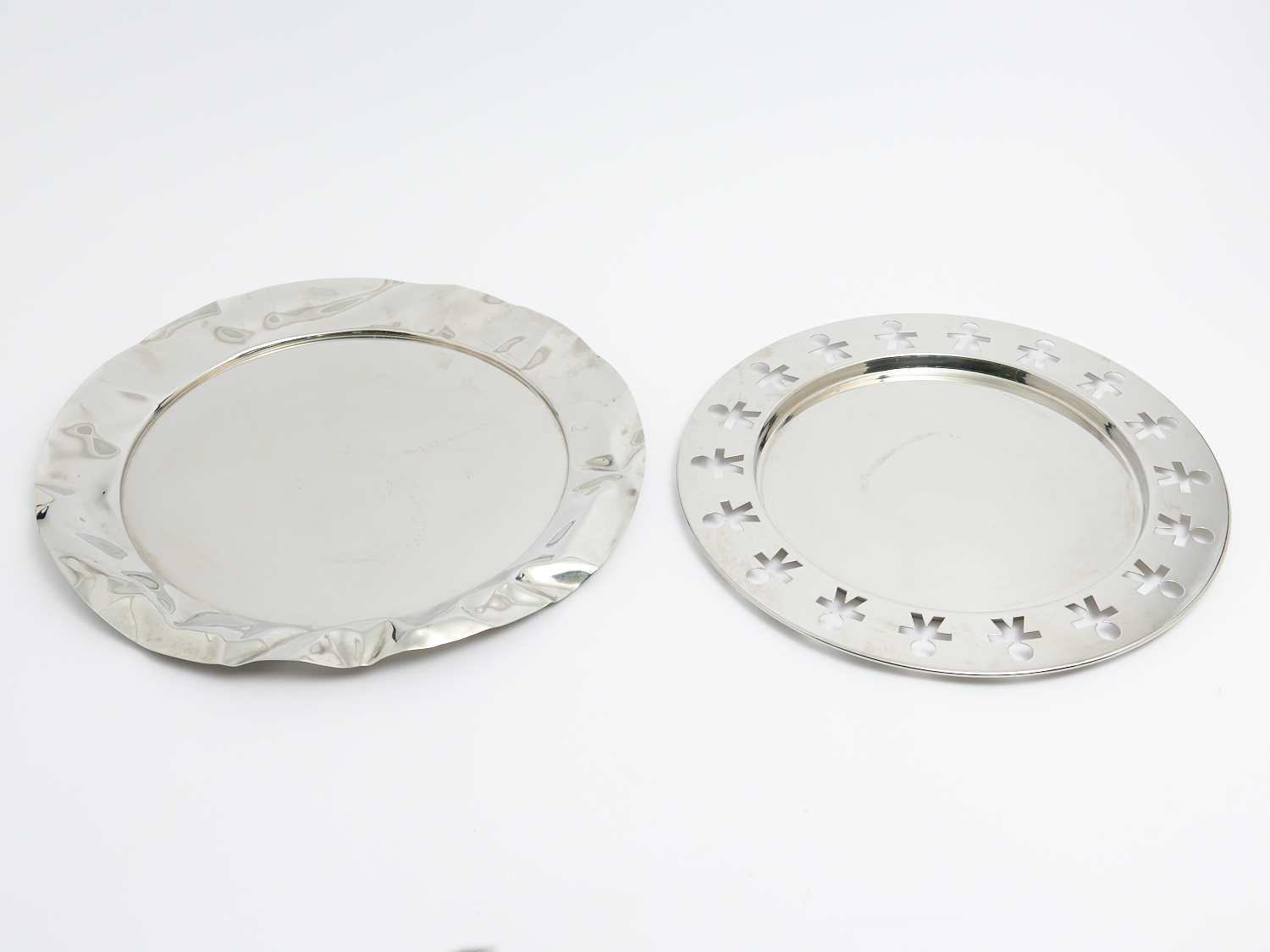 TWO ALESSI STAINLESS STEEL TRAYS INCLUDING GIROTONDO AND FOIX 44CM, LEONARD JOEL DELIVERY SIZE: MEDIUM