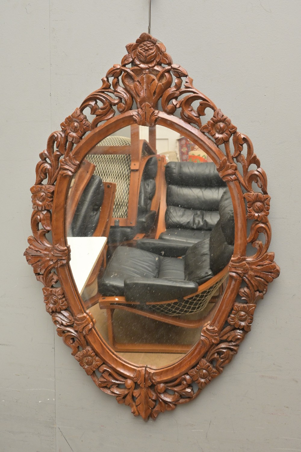 AN ANTIQUE STYLE ORNATELY CARVED WOODEN MIRROR (82H X 55W CM) (LEONARD JOEL DELIVERY SIZE: LARGE)
