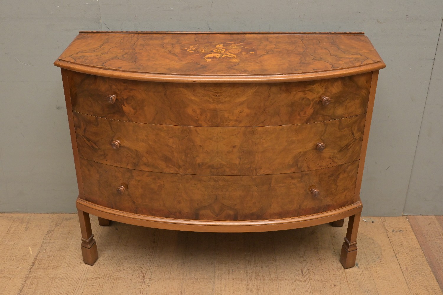 A FIGURED WALNUT BOW-FRONT CHEST OF DRAWERS, THE TOP WITH A MARQUETRY CENTREPIECE (A/F) (76H X 93W X 37D CM) (LEONARD JOEL DELIVERY SIZE: X-LARGE)