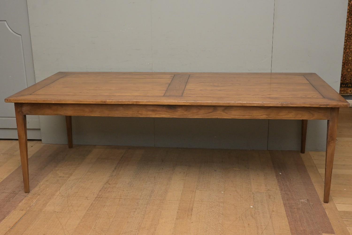AN OAK FAMRHOUSE TYPE DINING TABLE, ON TAPERING SUPPORTS (77H X 240W X 113D CM) (PLEASE NOTE THIS HEAVY ITEM MUST BE REMOVED BY CARRIERS AT THE CUSTOMER'S EXPENSE. LEONARD JOEL STAFF CANNOT ASSIST CARRYING THIS ITEM) (LARGE ITEM)