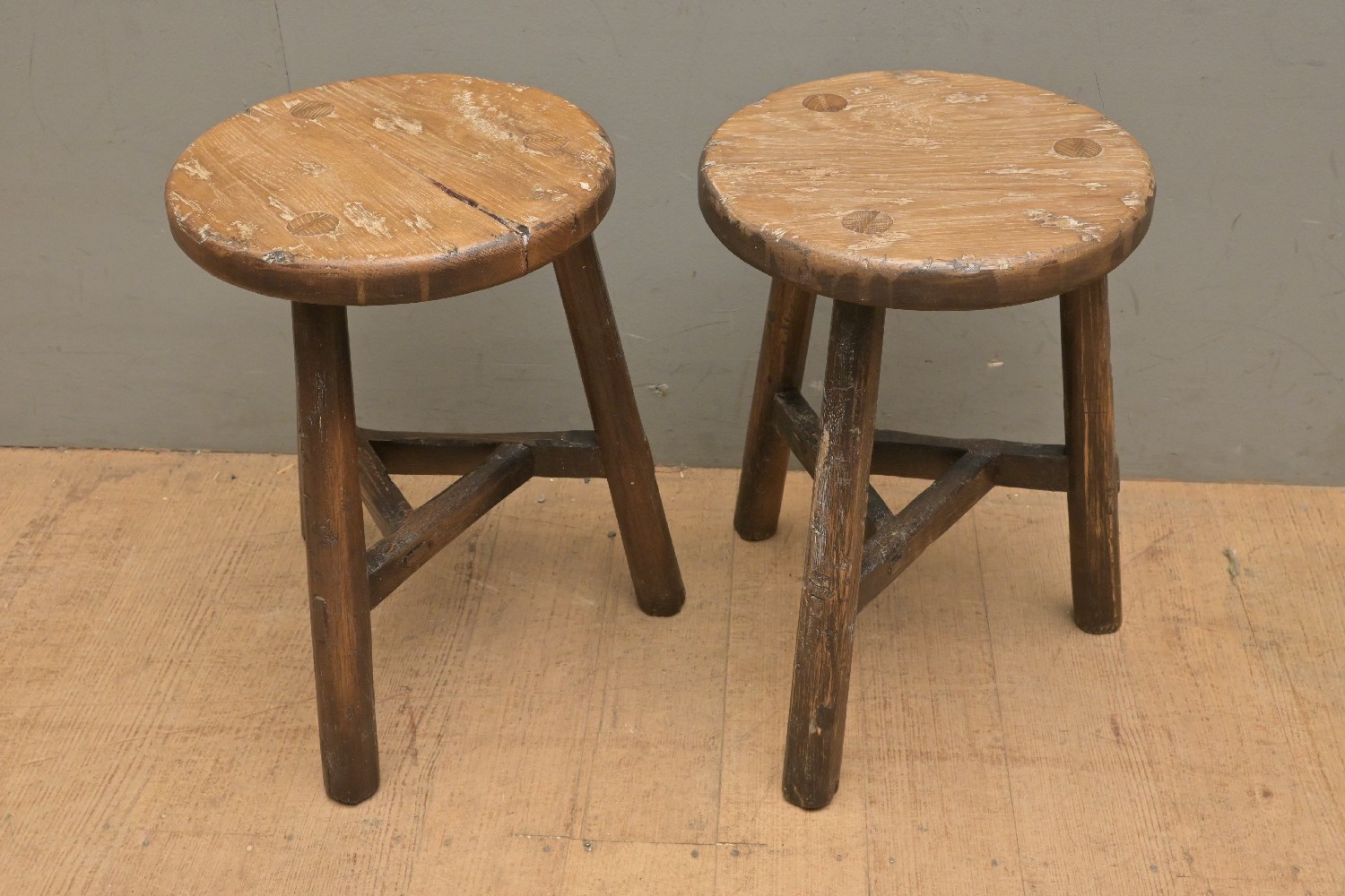 A PAIR OF RUSTIC ANTIQUE-STYLE OAK STOOLS (44H X 36D CM) (LEONARD JOEL DELIVERY SIZE: MEDIUM)