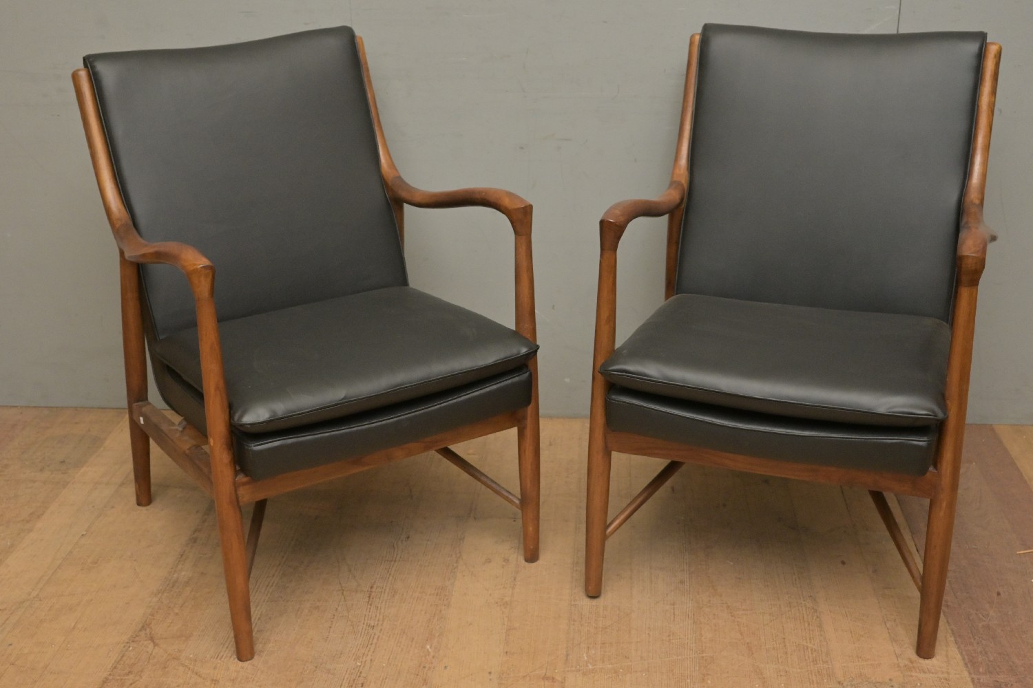 A PAIR OF MID-CENTURY STYLE ARMCHAIRS IN NEW UPHOLSTERY (89H X 63W X 73D CM) (LEONARD JOEL DELIVERY SIZE: X-LARGE)
