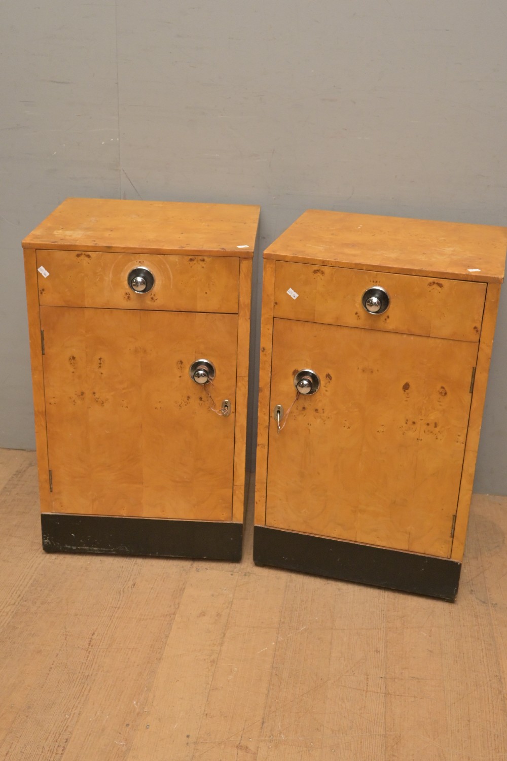 A PAIR OF ART DECO BIRDS EYE MAPLE BEDSIDE CABINETS (A/F) (72H X 45W X 43D CM) (LEONARD JOEL DELIVERY SIZE: LARGE)