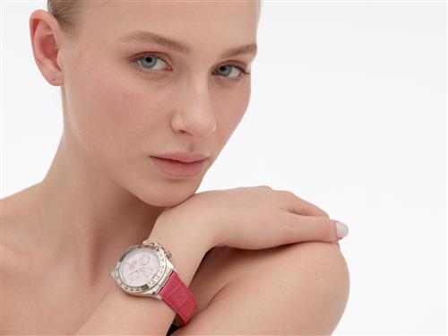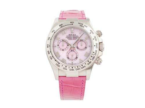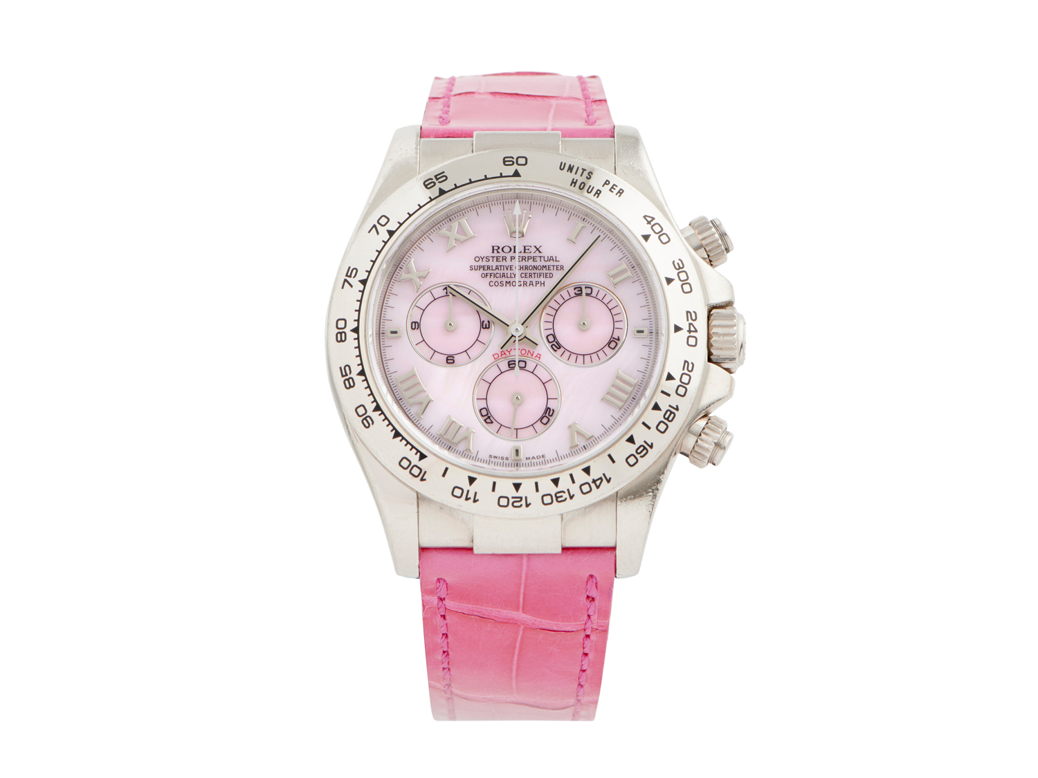 Closure: Rolex pink leather strap and 18ct white gold folding clasp,