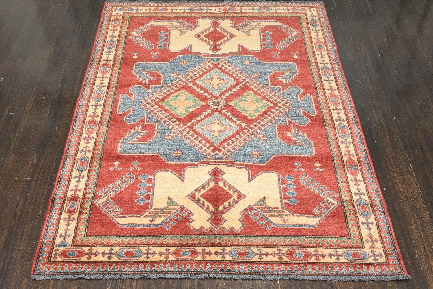 AN AFGAN KAZAK RUG IN CAUCASIAN DESIGN WITH VEGETABLE DYES, HANDSPUN WOOL, 100% PURE WOOL ON WOOL, ALL HAND WOVEN, REVERSIBLE (205 X 141CM) (LEONARD JOEL DELIVERY SIZE: LARGE)