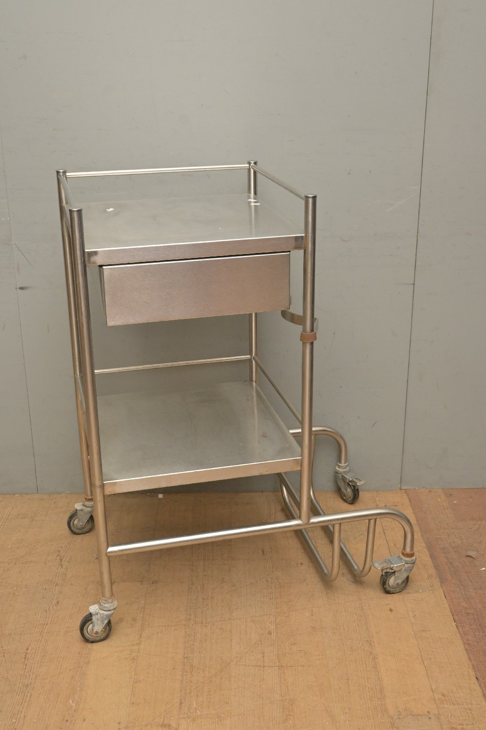 A STAINLESS STEEL TROLLEY WITH SINGLE DRAWER (A/F) (101H X 85W X 52D CM) (LEONARD JOEL DELIVERY SIZE: LARGE)