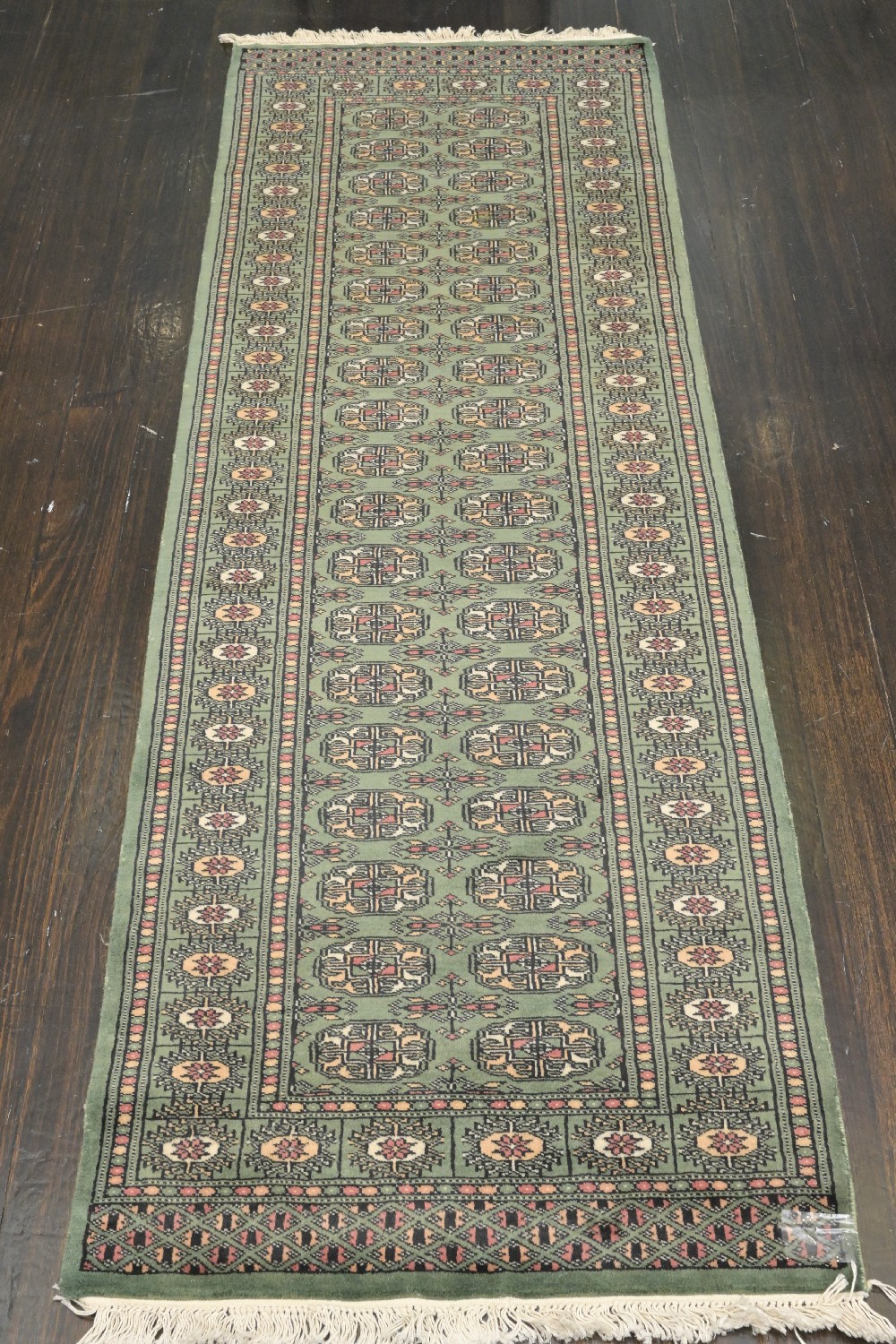 A RARE SOFT GREEN QUEEN BOKHARA RUNNER, 100% WOOL, ALL HANDKNOTTED, COLOUR FAST (213 X 77 CM) (LEONARD JOEL DELIVERY SIZE: LARGE)