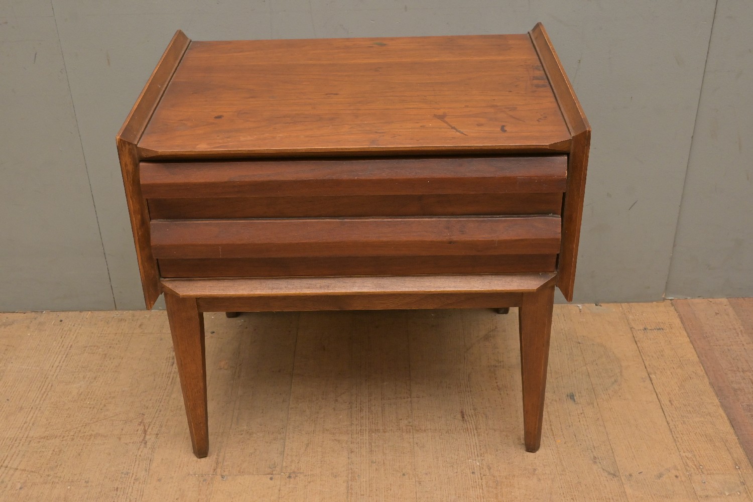 AN MCM WALNUT TWO DRAWER BEDSIDE TABLE (A/F) (59H X 61W X 43D CM) (LEONARD JOEL DELIVERY SIZE: LARGE)