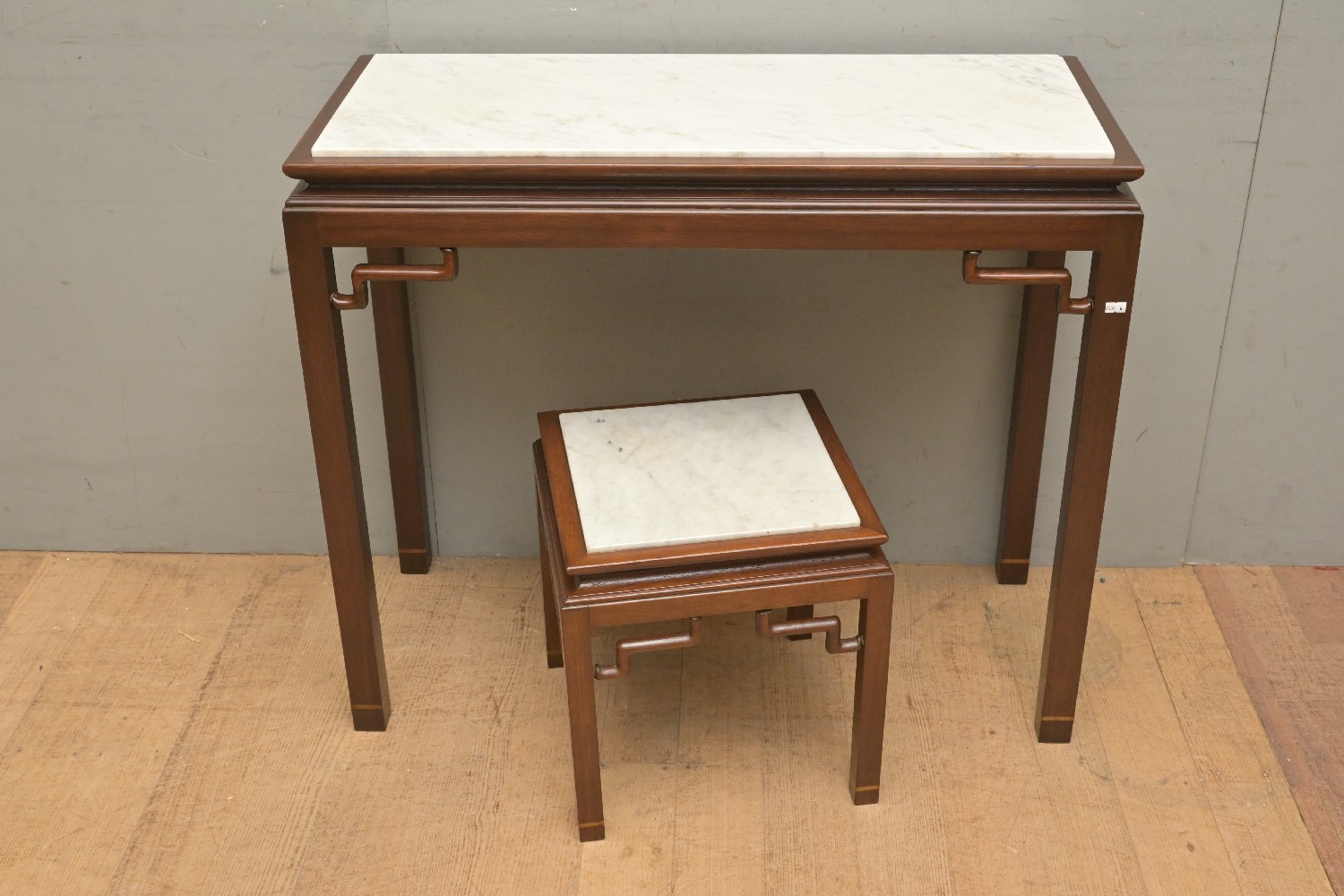 A CHINESE STYLE CONSOLE TABLE WITH MARBLE TOP AND MATCHING LAMP TABLE BY DECRO (LARGEST 77H X 90W X 41D CM) (PLEASE NOTE THIS HEAVY ITEM MUST BE REMOVED BY CARRIERS AT THE CUSTOMER'S EXPENSE. LEONARD JOEL STAFF CANNOT ASSIST CARRYING THIS ITEM) (LARGE ITEM)