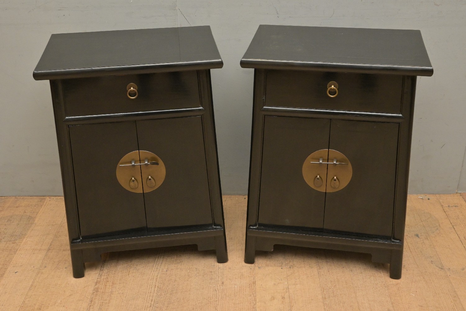 A PAIR OF CHINESE EBONISED BEDSIDE CABINETS (A/F) (74H X 53W X 37D CM) (LEONARD JOEL DELIVERY SIZE: LARGE)
