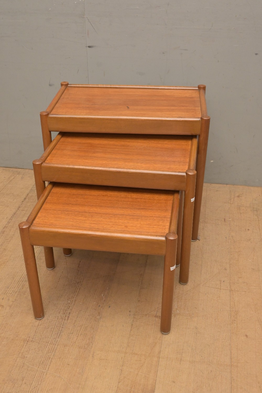 A 1960s / EARLY '70s NEST OF THREE TEAK OCCASIONAL TABLES (A/F) (55H X 62W X 40D CM) (LEONARD JOEL DELIVERY SIZE: LARGE)