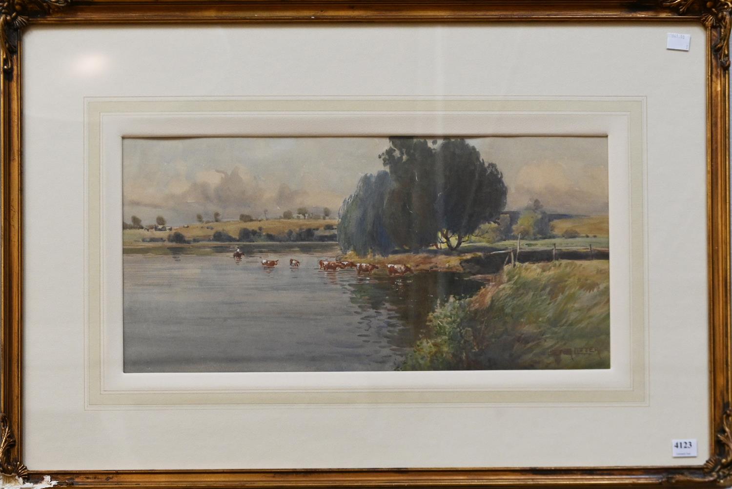 WILLIAM LISTER LISTER, CATTLE IN LANDSCAPE, WATERCOLOUR AND GOUACHE ON PAPER, SIGNED LOWER RIGHT, 23.5 X 50CM, FRAME SIZE: 50 X 75CM