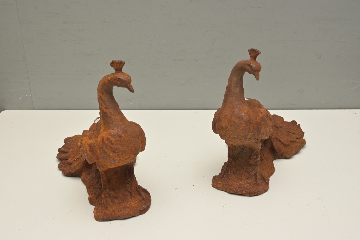 A PAIR OF CAST IRON PEACOCKS (32H X 44W CM) (LEONARD JOEL DELIVERY SIZE: LARGE)