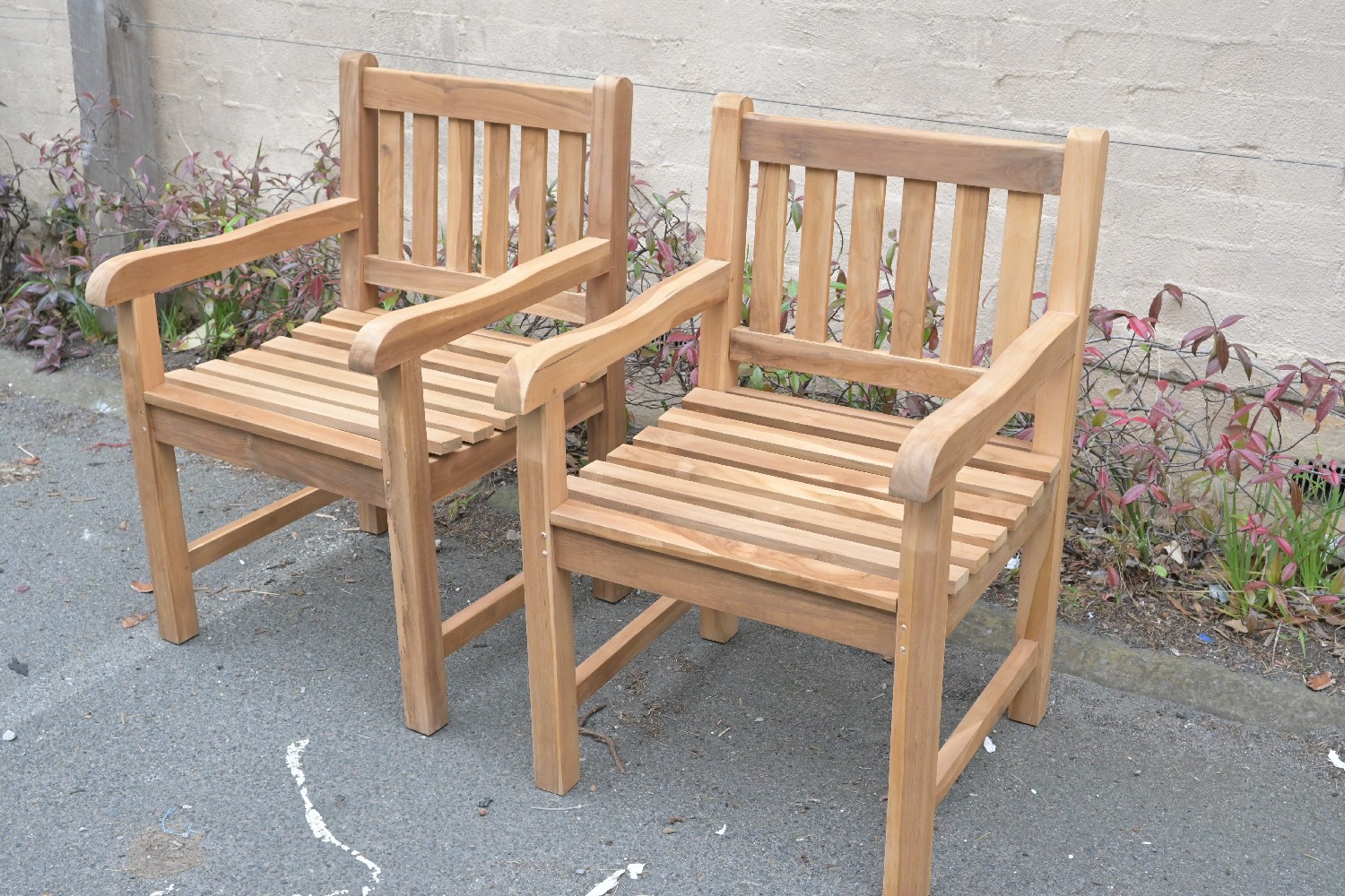 A PAIR OF TEAK CARVER CHAIRS (92H X 61W X 62D CM) (LEONARD JOEL DELIVERY SIZE: X-LARGE)