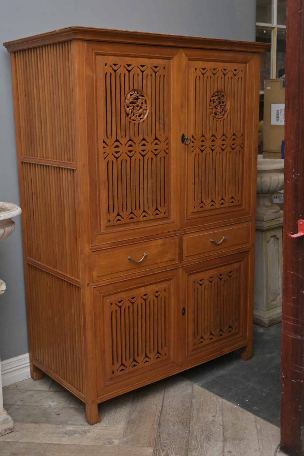 AN INDONESIAN INFLUENCED FOUR DOOR STORAGE CABINET (175H X 118W X 66D CM) (PLEASE NOTE THIS HEAVY ITEM MUST BE REMOVED BY CARRIERS AT THE CUSTOMER'S EXPENSE. LEONARD JOEL STAFF CANNOT ASSIST CARRYING THIS ITEM) (LARGE ITEM)