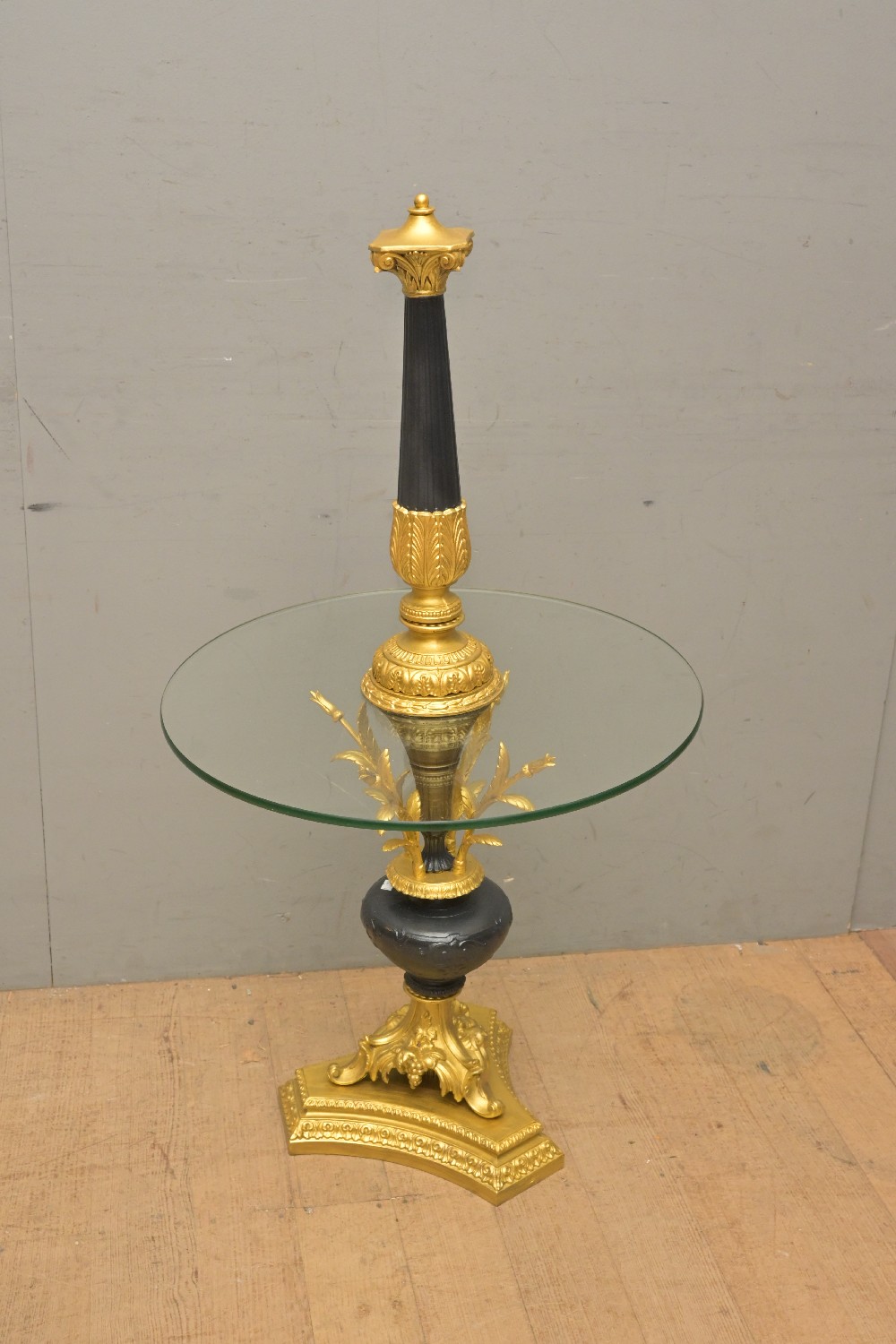 A GILT AND BLACK-JAPANNED METAL AND GLASS OCCASIONAL TABLE IN NEO-CLASSICAL MANNER (106H X 55D CM) (LEONARD JOEL DELIVERY SIZE: X-LARGE)