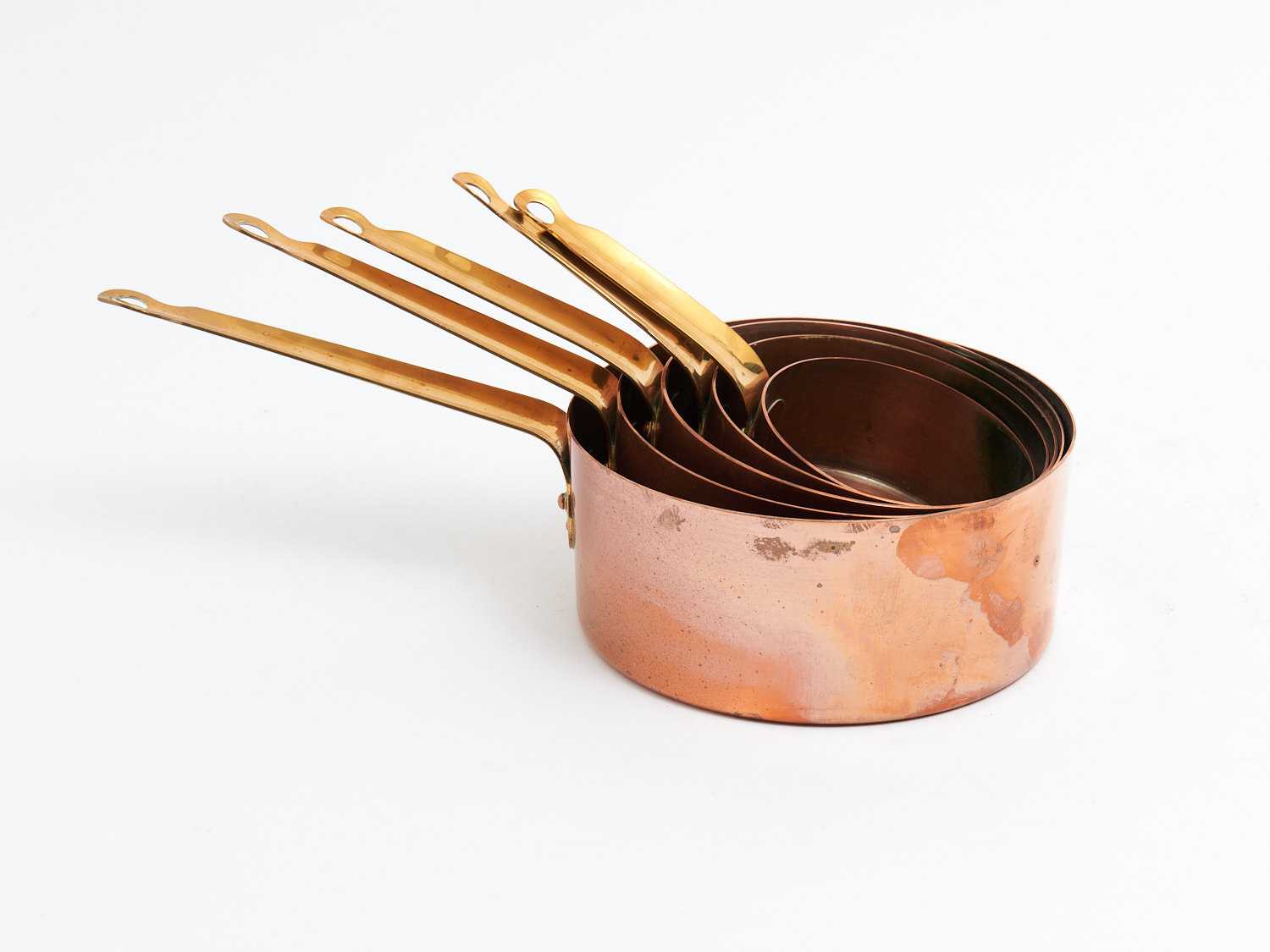 A SET OF FIVE COPPER SAUCEPANS WITH BRASS HANDLES DIA.17.5CM (LARGEST), LEONARD JOEL DELIVERY SIZE: MEDIUM