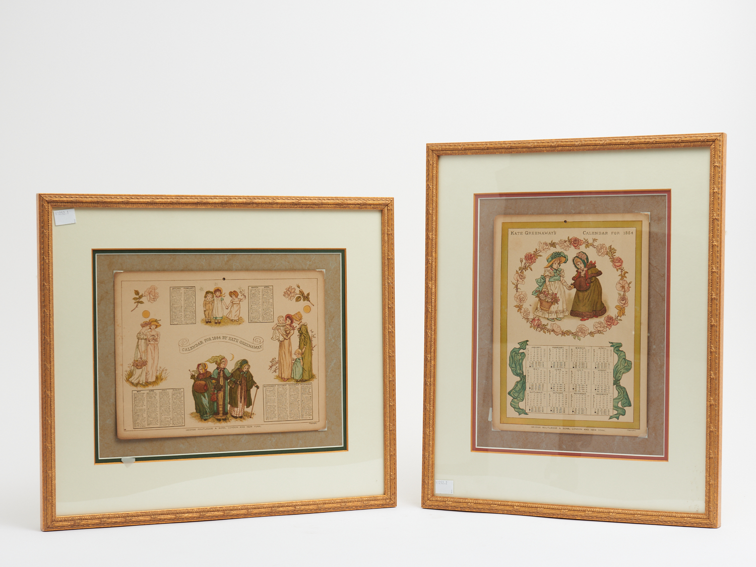 KATE GREENAWAY, TWO FRAMED LITHOGRAPHIC PRINTS, CALENDAR FOR 1884, 43.5 X 36CM (LARGEST), LEONARD JOEL DELIVERY SIZE: MEDIUM