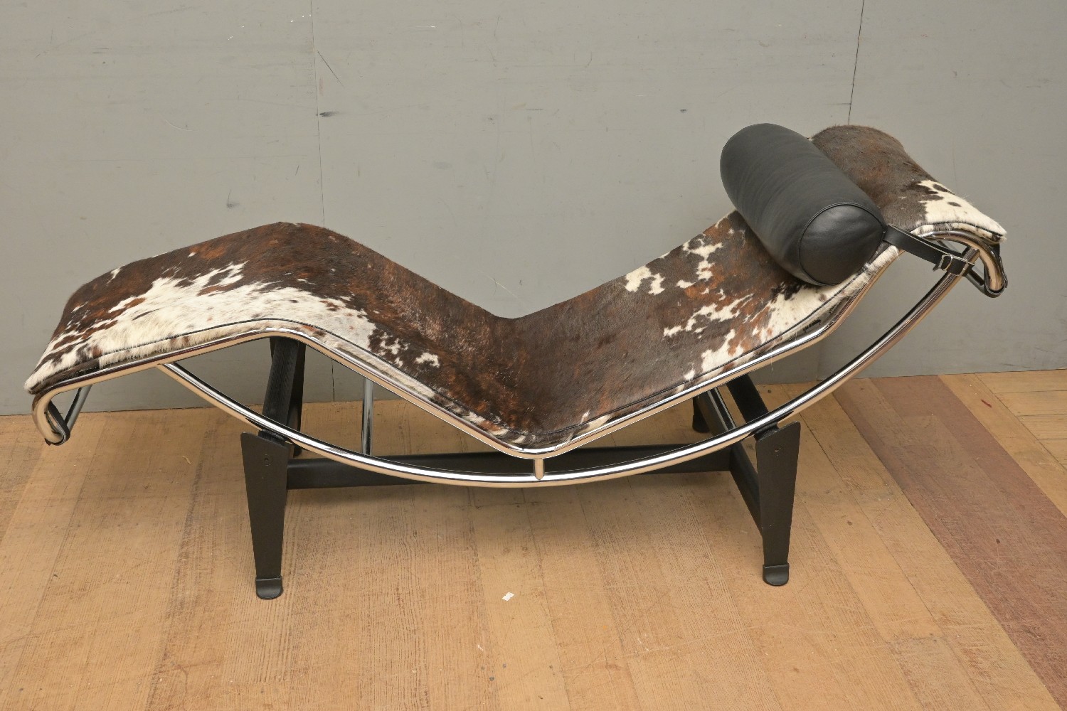 A LE CORBUSIER STYLE CHAISE LONGUE UPHOLSTERED IN COWHIDE BY ALIVAR (72H X 53W X 163D CM) (LEONARD JOEL DELIVERY SIZE: X-LARGE)